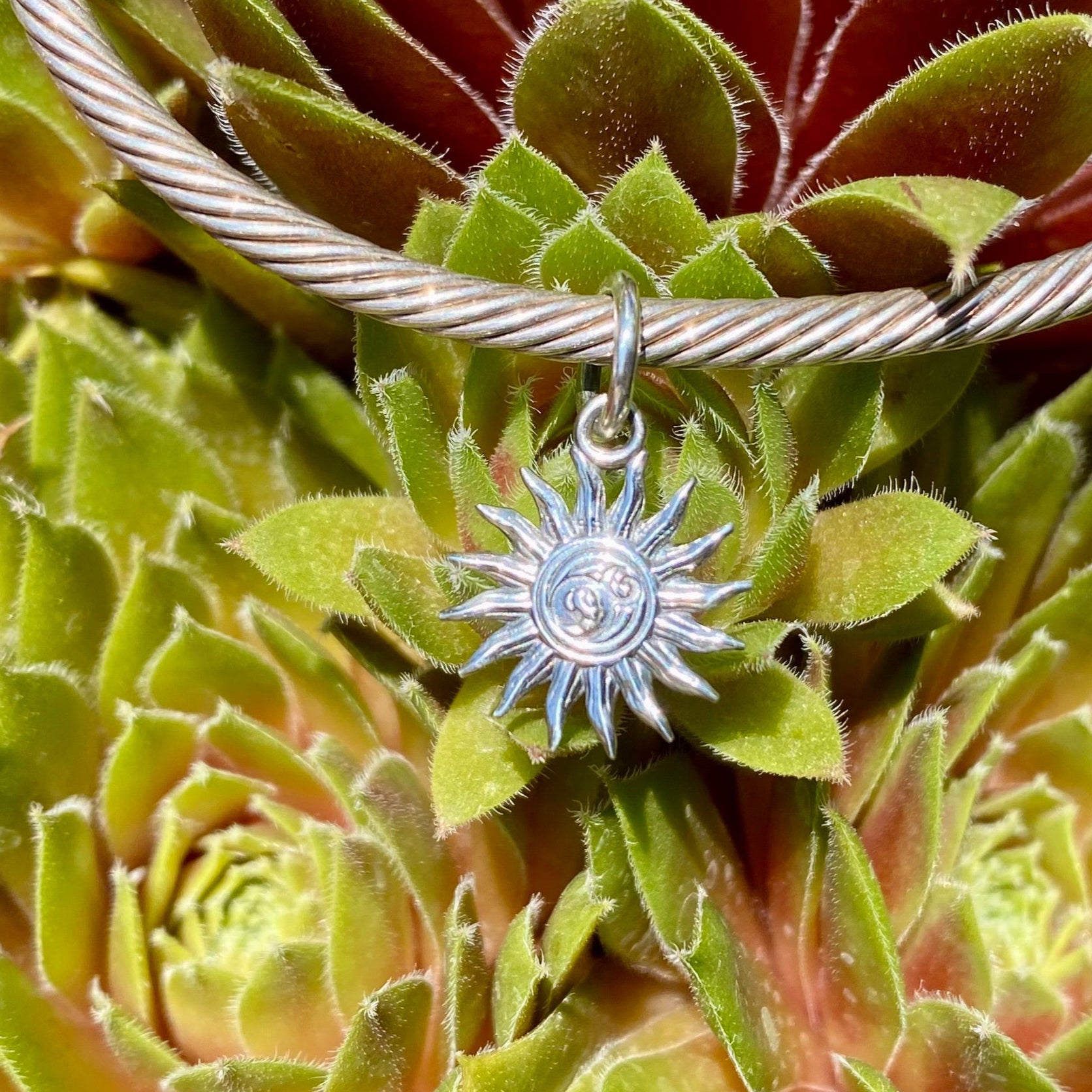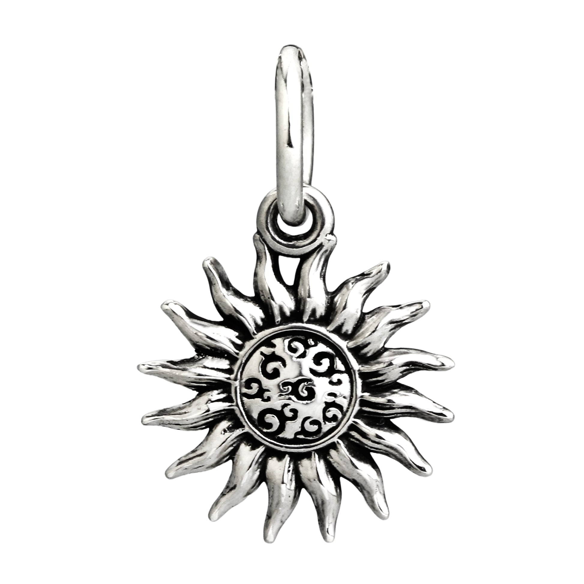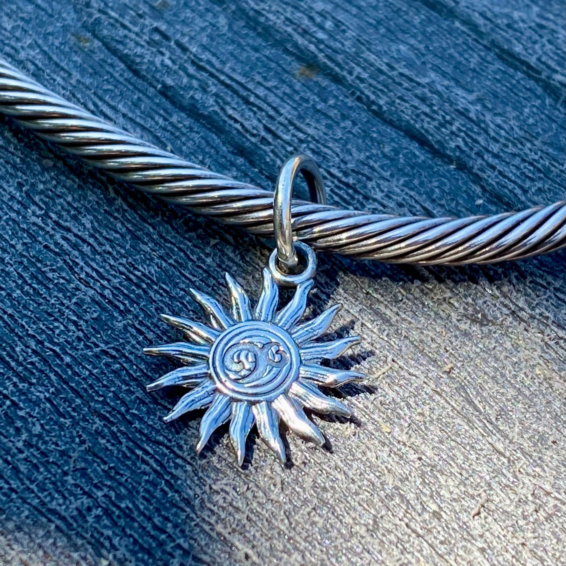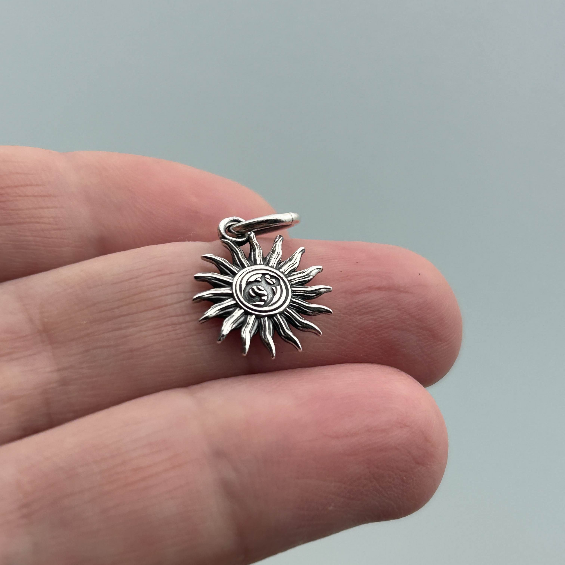 A charm kissed by the sun, forged in silver, and spun with the spirit of summer. One side swirls with playful OHM clouds, drifting across a radiant sky. Turn it over and feel the calm of a gentle spiral, the sun in quiet reflection.