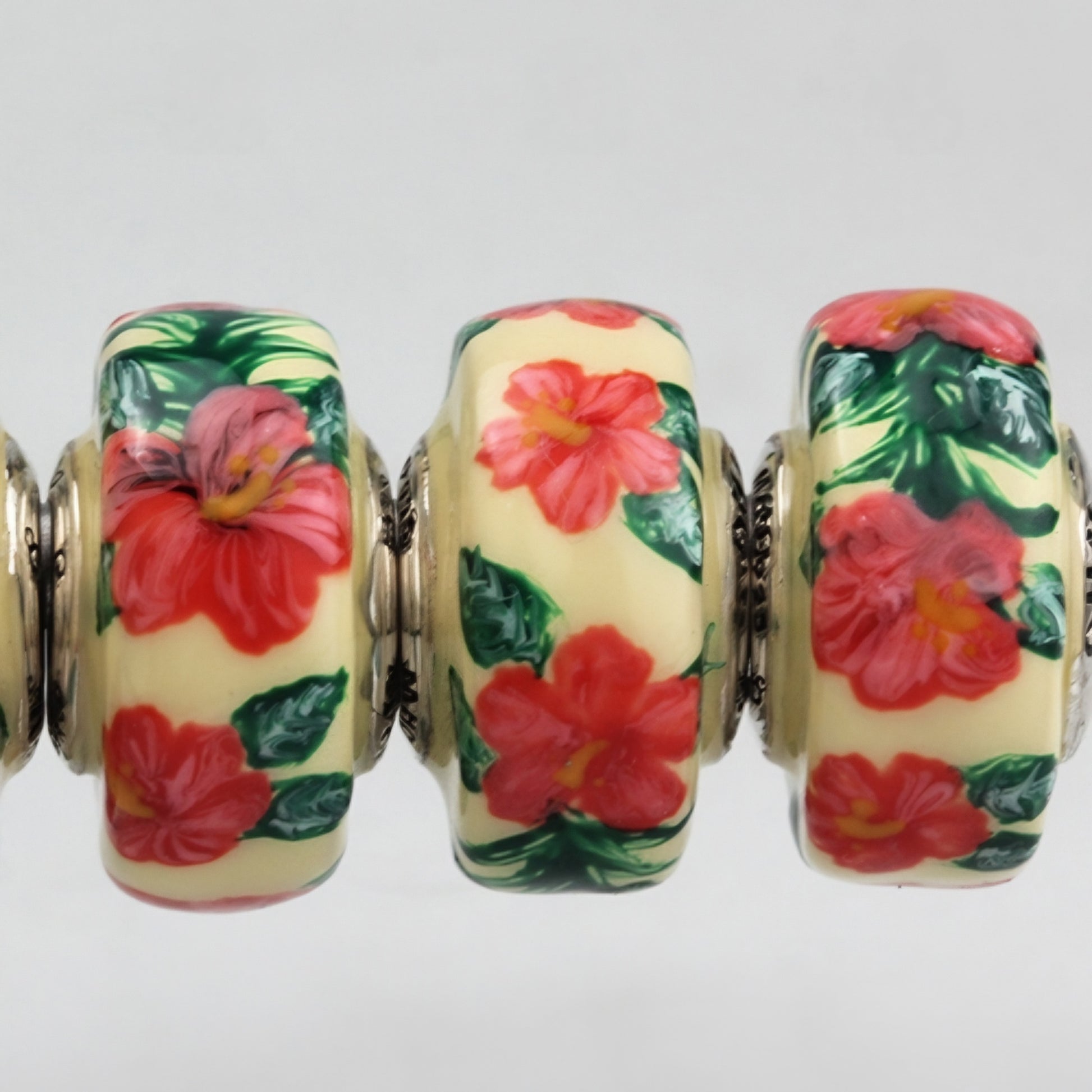 This is a silver bead in glass bead shape that is painted with enamel.